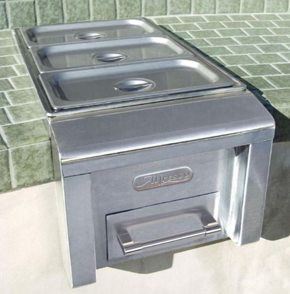 Features 3 removable stainless steel food pans with covers, and a slide-out drawer for Sterno-type fuel canisters.